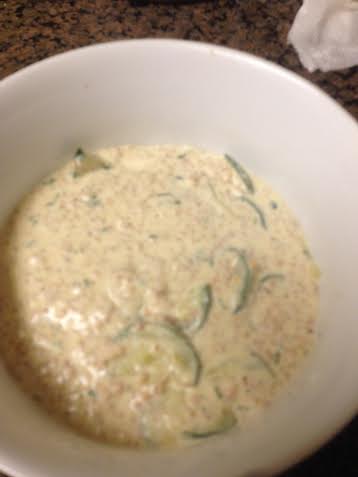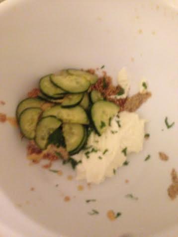 Combine the above ingredients in a small sauce pot and bring to a light, almost imperceptible simmer for 45 minutes. Check occasionally to insure the mustard seeds are covered, and add water in small amounts if necessary. The final product can be filtered through a fine mesh strainer or cheesecloth and leftovers can be refrigerated for months. While the seeds are simmering, cut 1/2 a large cucumber in 1/2 lengthwise. Cut into almost paper thin slices and place in a mason jar. After the mustard seeds are done, strain the hot liquid and pour over the cucumber slices. Allow to rest at least 15 minutes.