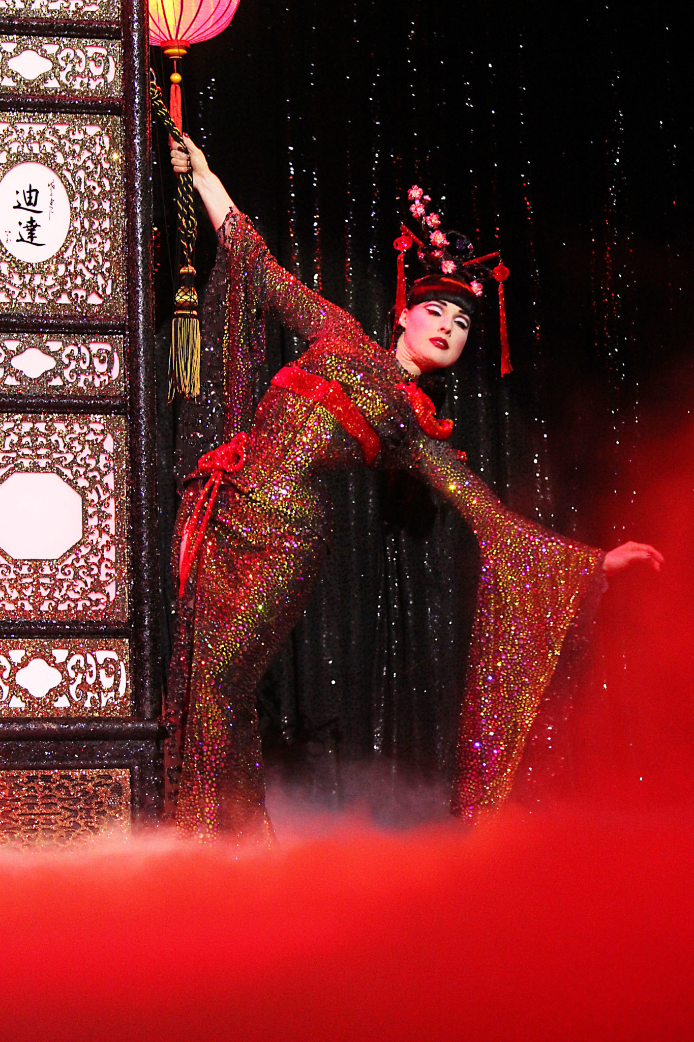 As the 90 minute revue came to a close, Dita ended with her newest addition to her touring routine, The Opium Den. Donning a traditional version of a Geisha costume, custom made by fellow performer Catherine D’Lish, the curtains opened to reveal her lying on a bed hanging with light lanterns and covered in pillows, taking long puffs from a beautiful Swarovski covered Cheongsam. Stripping down to only a thong and tassels, she pulled out her most stunning prop of the show, a traditional Oriental fan covered with, yes you guessed it, Swarovski crystals. Walking the length of the stage, she used the fan to silhouette her body enticingly, as smoke billowed from behind the curtains. From behind Dita, four mysterious hands began to caress her teasingly as she gives in to their pleasures. In what was without an argument the climax of the night, the audience was then showered with flower petals as the lights dimmed and curtains came to a close. All in all, Strip Strip Hooray! was exactly what I had wanted it to be; Dita in all of her glory, showcasing just what American burlesque is about – sexy routines, good humor, and innovative techniques. The return of this tour, as well as having aboard the entire original cast, only further proves Dita Von Teese’s role in the burlesque scene as one of the best.