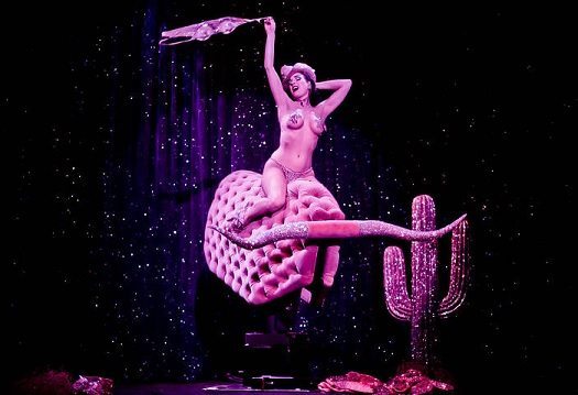 Plopped into a large martini glass embellished with over 250,000 Swarovski crystals and complete with an olive sponge, Dita Von Teese looked every bit of an appetizing star as she removed her tuxedo to reveal a custom-made Mr. Pearl corset and crystal-studded thong. For the very first time since the show had started, the crowd was awestruck in silence. Following Dita’s first act was New York based dancer Dirty Martini, who is famed for her tassel twirling (she won first place at the Miss Exotic World Awards back in 2004) and had no qualms showing off her skills, even giving our host’s face a ‘titty tassel helicopter’, as he called it. The liveliness and spontaneity associated with burlesque was in full swing as the revue rolled along the line of performers. For Dita’s second act, she became a Rhinestone Cowgirl, completely decked in pink, and of course, more Swarovski crystals. Straddling an all pink mechanical bull, she simultaneously performed a scintillating strip tease, drawing whistles and cat calls from the crowd.
