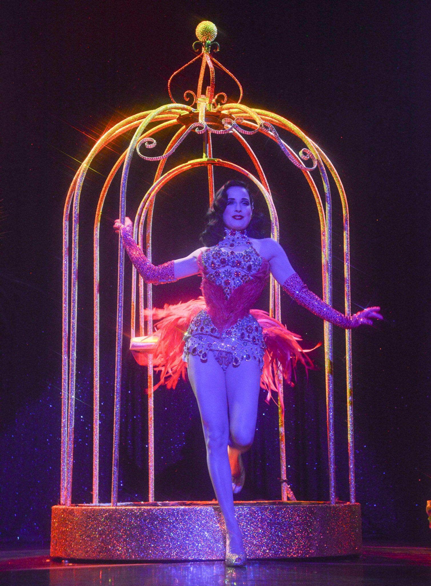 Choosing her famed routine, Bird of Paradise, as her third act, Dita Von Teese appeared inside a glittering cage wearing a costume made entirely of exotic magenta pheasant feathers. Reinventing the traditional fan dance, she playfully strutted the stage, flirting with the audience as she ended her dance perched inside of the cage, which was now spinning, on a swing.