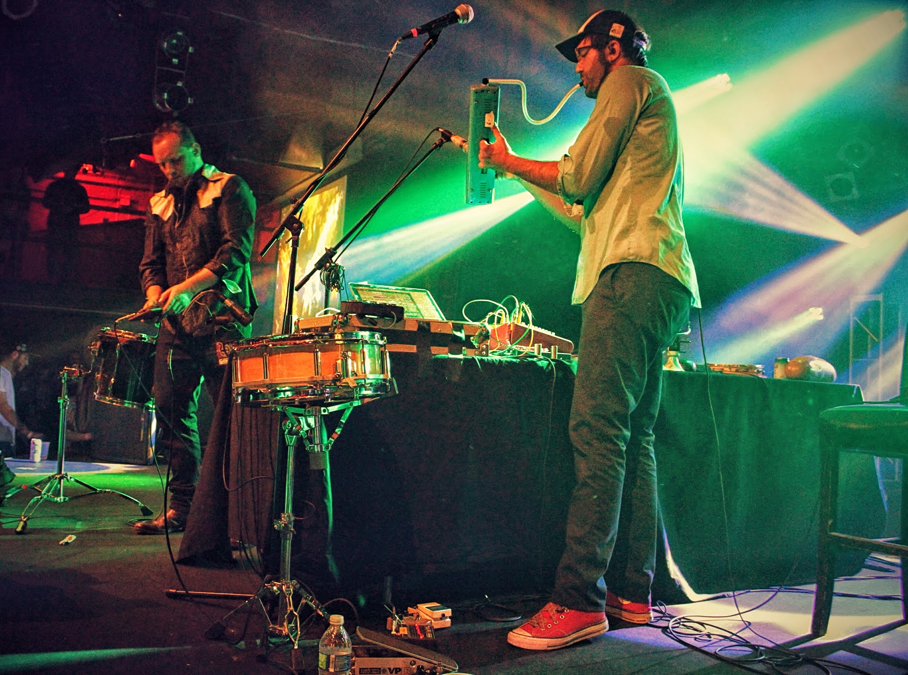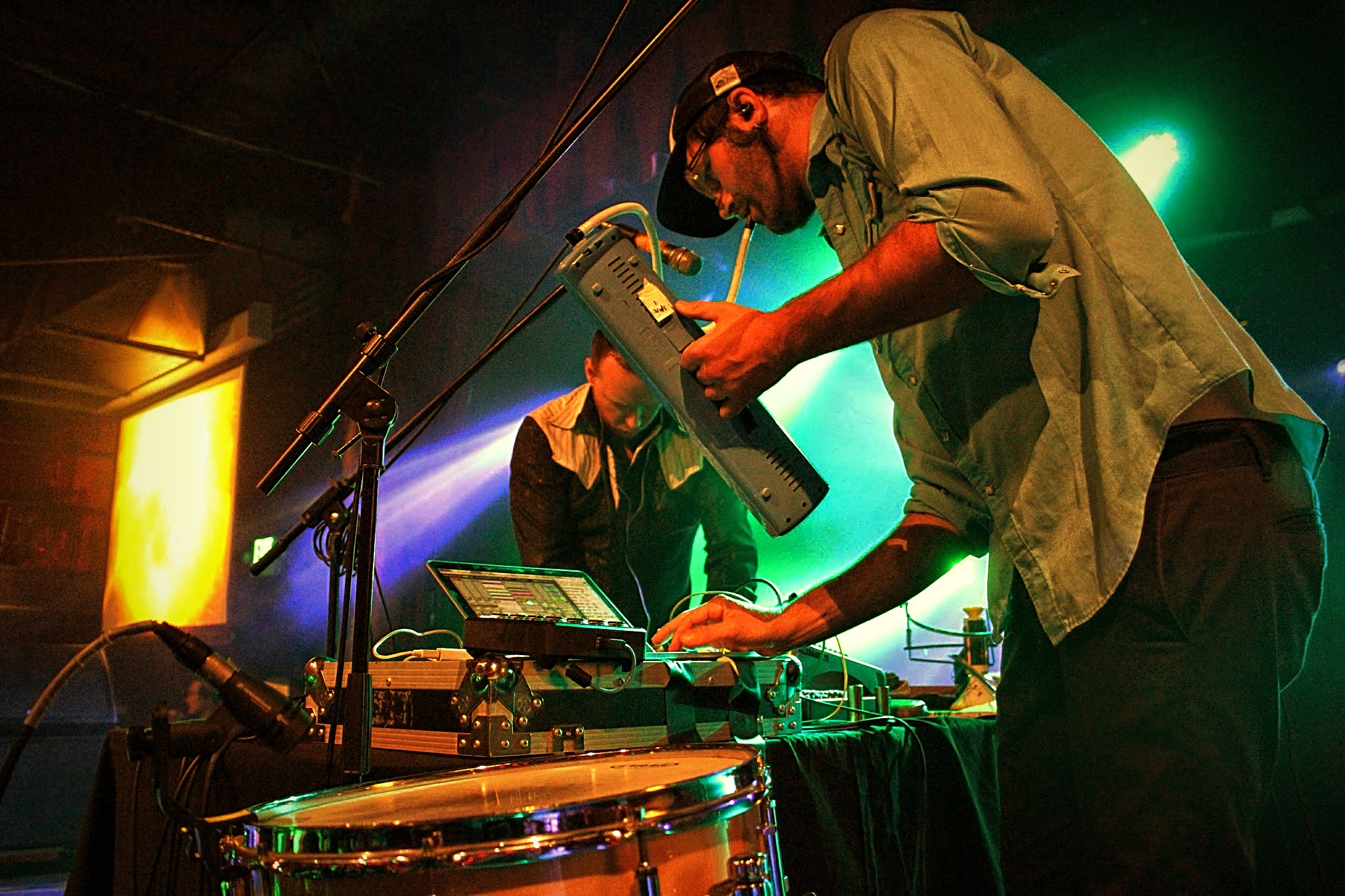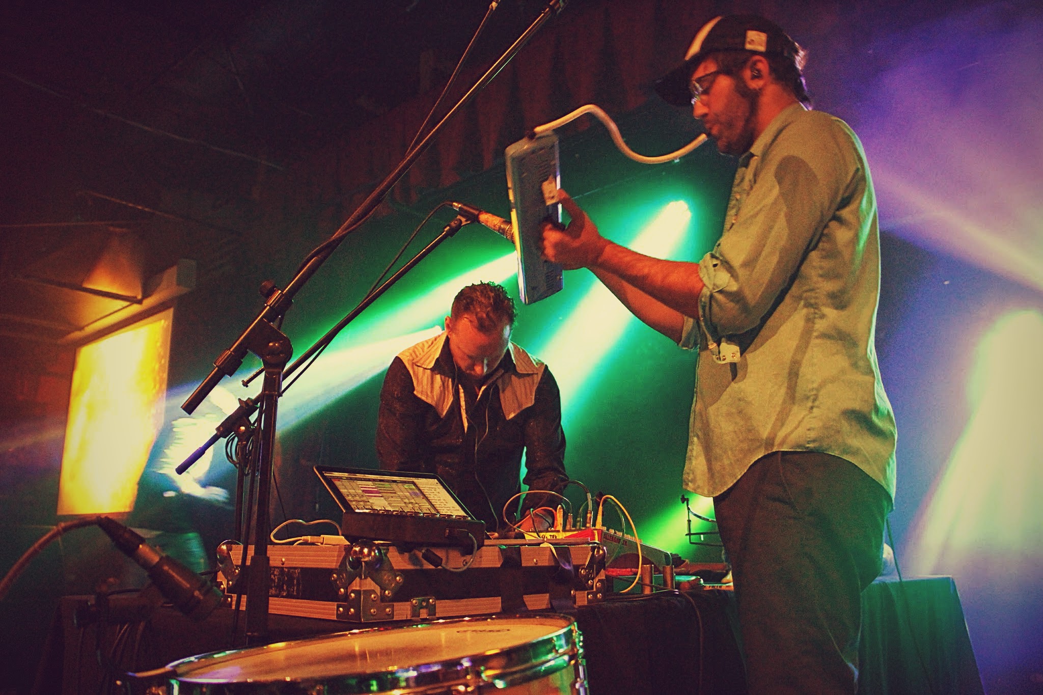 David Satori and Evan Fraser are two artists who simply thrive on the fresh breath of creation. Continuously pushing beyond the confines of their innovative and sexy swamp-backporch folk sound, Dirtwire has impressed me numerous times through headphones alone as well as when I’ve been lucky enough to see them live (most recently during Sonic Bloom). Yet each of those experiences, though all near and dear, paled in comparison when reflecting on the captivating performance given by the duo on that Friday night at Cervantes. With the nights energy at its peak, Dirtwire was welcomed to the stage with loving arms and shouts of admiration from hundreds of Colorado heads.