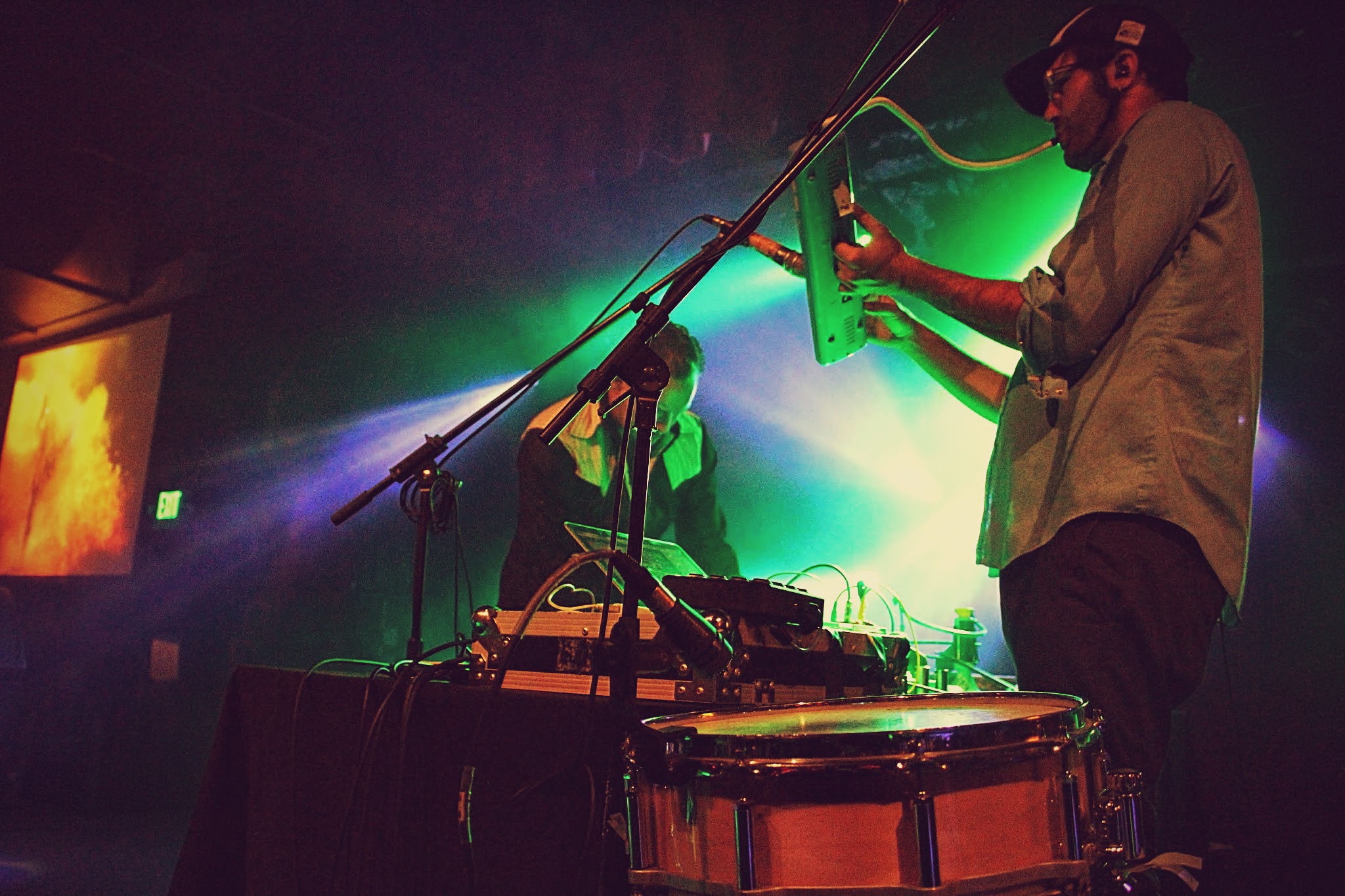 Positioning themselves on either side of a table featuring a plethora of small instruments, Dirtwire launched into their most spell-binding performance to date. Large screens flashed clips of black and white boudoir photography and curvaceous women dancing in shadowboxes, setting a sultry yet mischievous vibe within the dark decor of Cervs. My favorite track from the new release, titled ‘Only One’, sounded even more full-bodied and seductive than I’d imagined it would be when the group played it live.