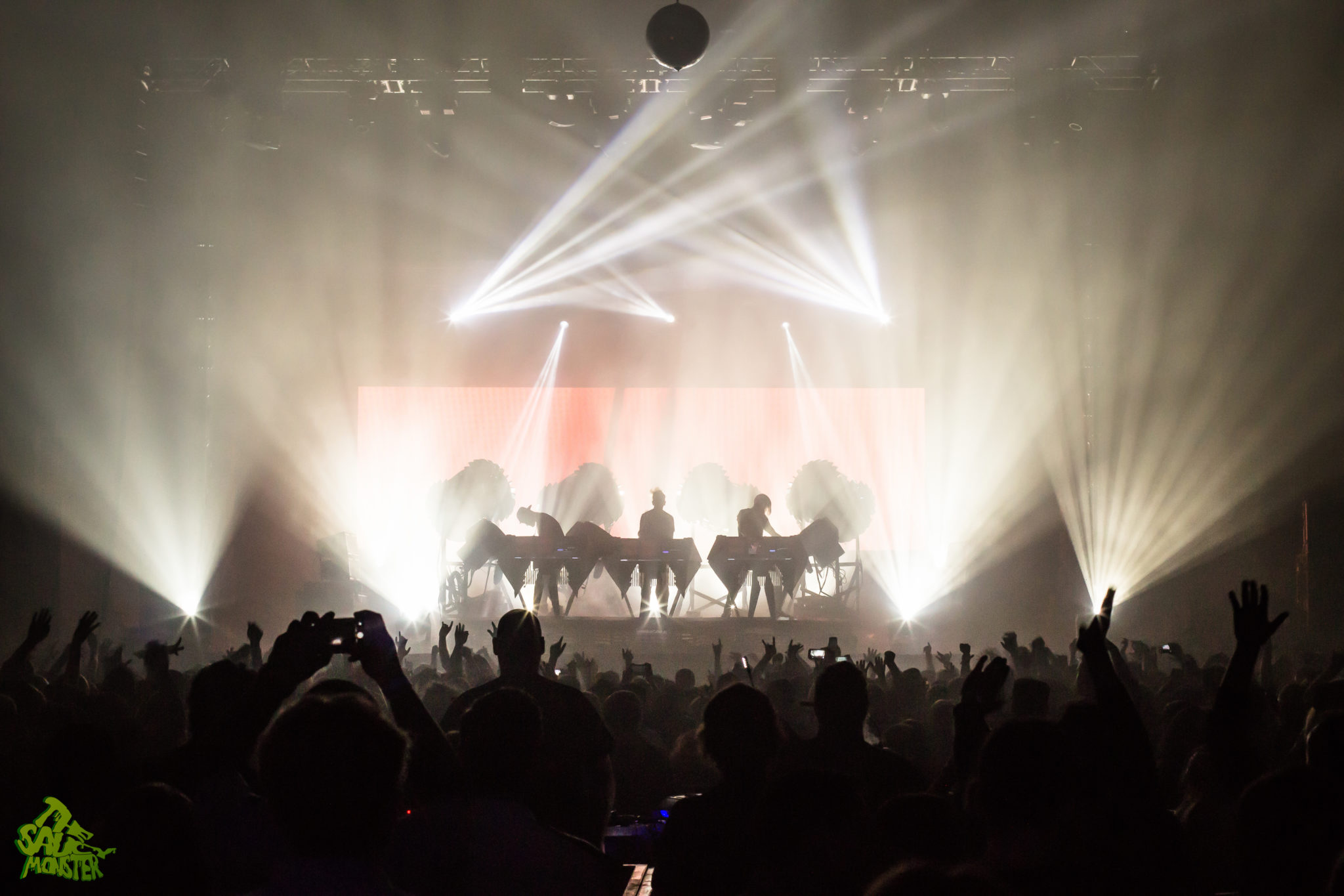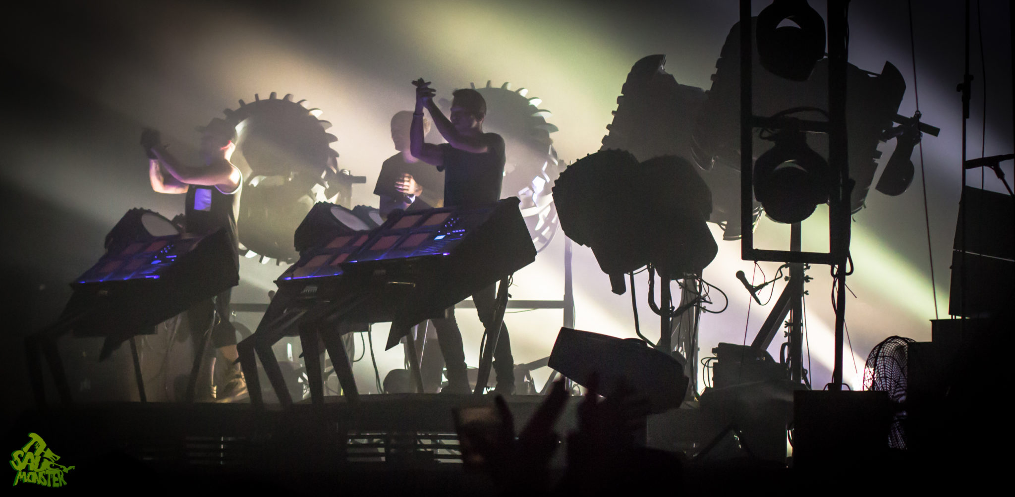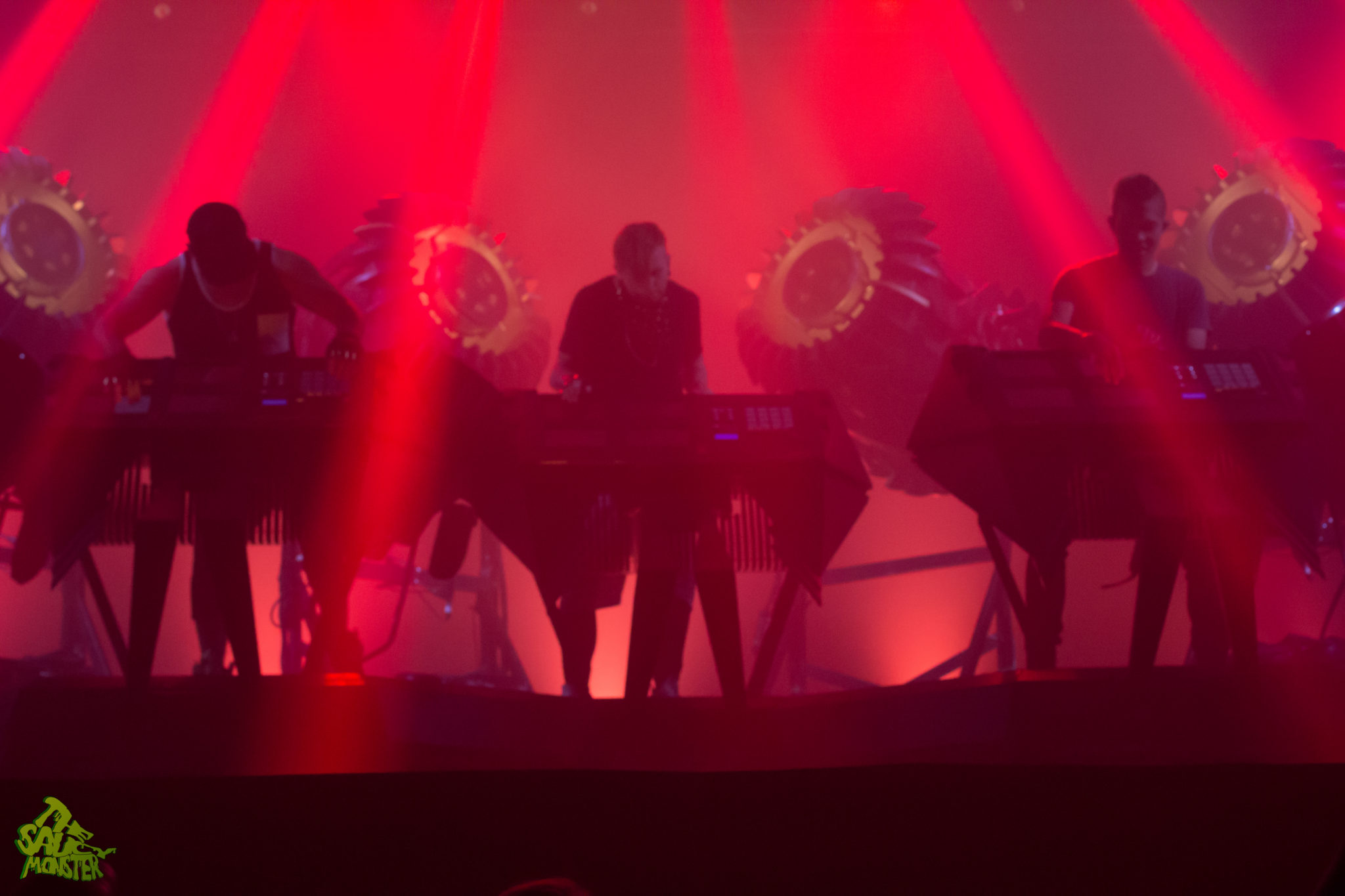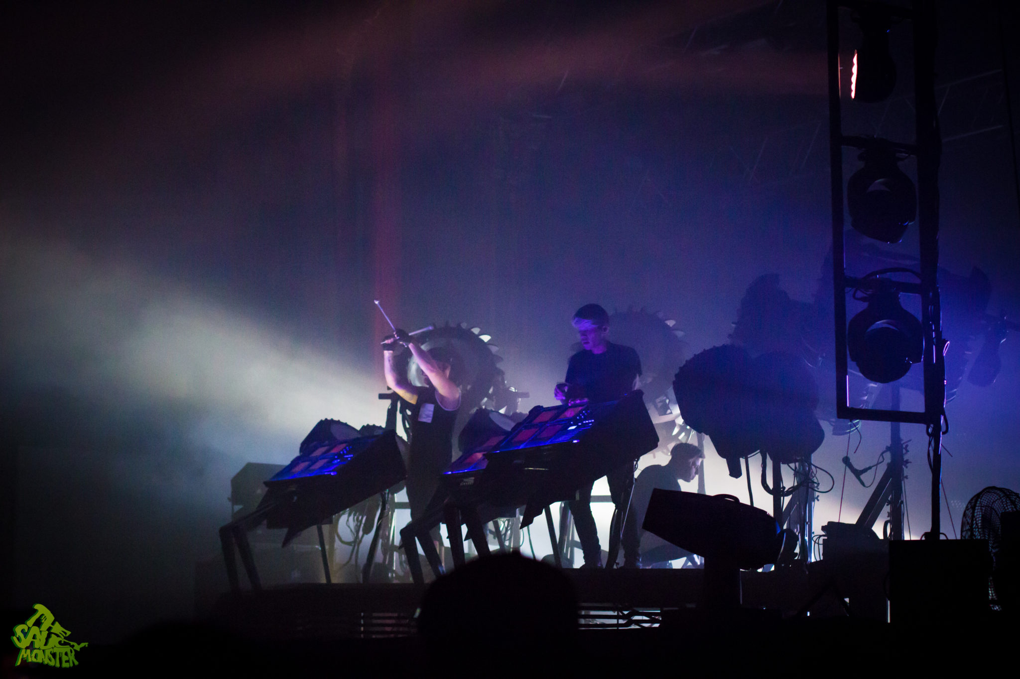 The Glitch Mob was up last to headline the night. The crowd cheered wildly as the trio took the stage. Smoke filled the air and powerfully bright backlights placed The Glitch Mob in a silhouetted figure against their enormous industrial-robot like drums. This really set the tone of the performance, immediately hinting towards Glitch Mob’s dark bass-heavy sounds. This was a first time Glitch Mob performance for me as well, to which I was simply amazed watching their creativity on stage. For those who aren’t familiar, The Glitch Mob plays a mixture of live instruments, mainly drums, while also using a variety of midi controllers which are displayed facing outwards to the audience, so the crowd can see how each member is performing live. The show was definitely a very unique experience. It’s always pleasing to see such a creative live-electronic act; it’s a true breath of fresh air from the infinite amount of DJ sets we see today. Good times, cool show!