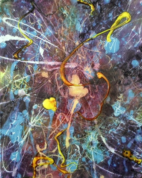I love the detail and color I am able to get with the latex paint and alcohol inks (which I mix myself in large mason jars) and I love how my paintings depict the idea behind them…..even if it’s only in my twisted brain. I don’t like the fact that my studio space limits me at the present time as to being able to do super-large canvasses. I’m working on changing that.