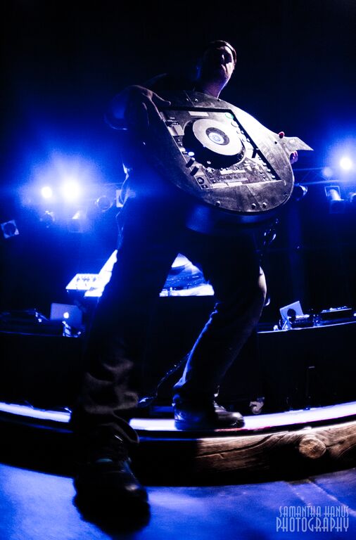 At this time in the show, Cut Chemist and Nu-Mark dueled onstage in a classic yet futuristic DJ battle. Welding instruments that have to be seen to be believed, Nu-Mark’s keytar meets turntable fought against Cut Chemist’s insane wearable CDJ mixer – to say this was one of the rowdiest parts of the night is putting it mildly. The battle ended with the two DJs mixing Dead Prez’s ‘Bigger Than Hip Hop’ by scratching the large turntable that had been center stage the whole night, finally revealing it to be usable.