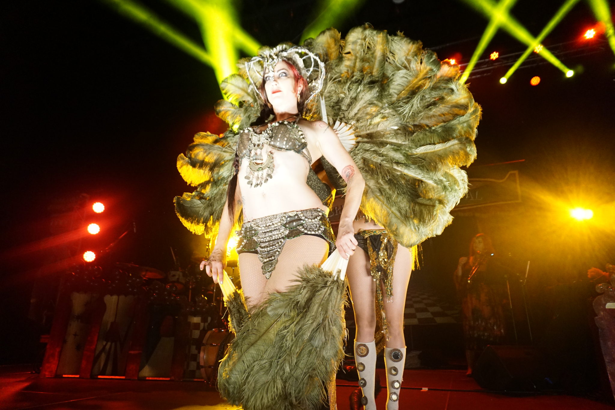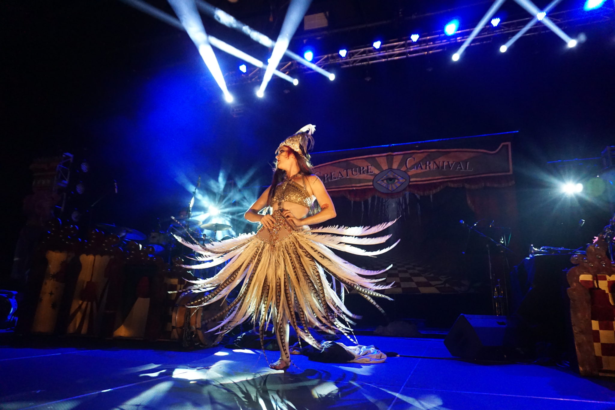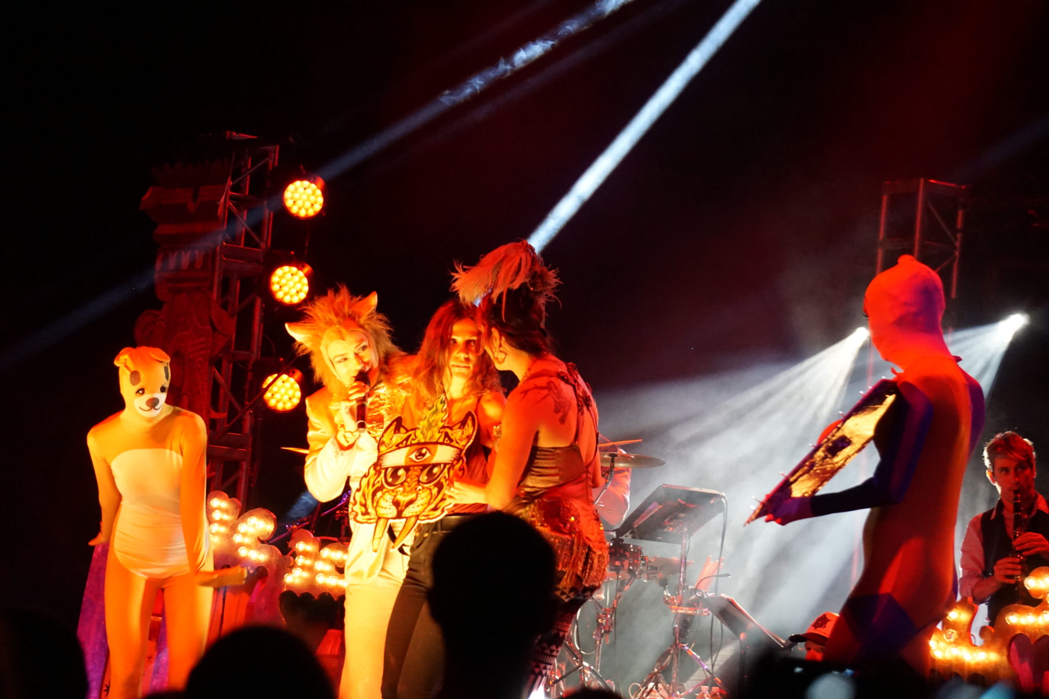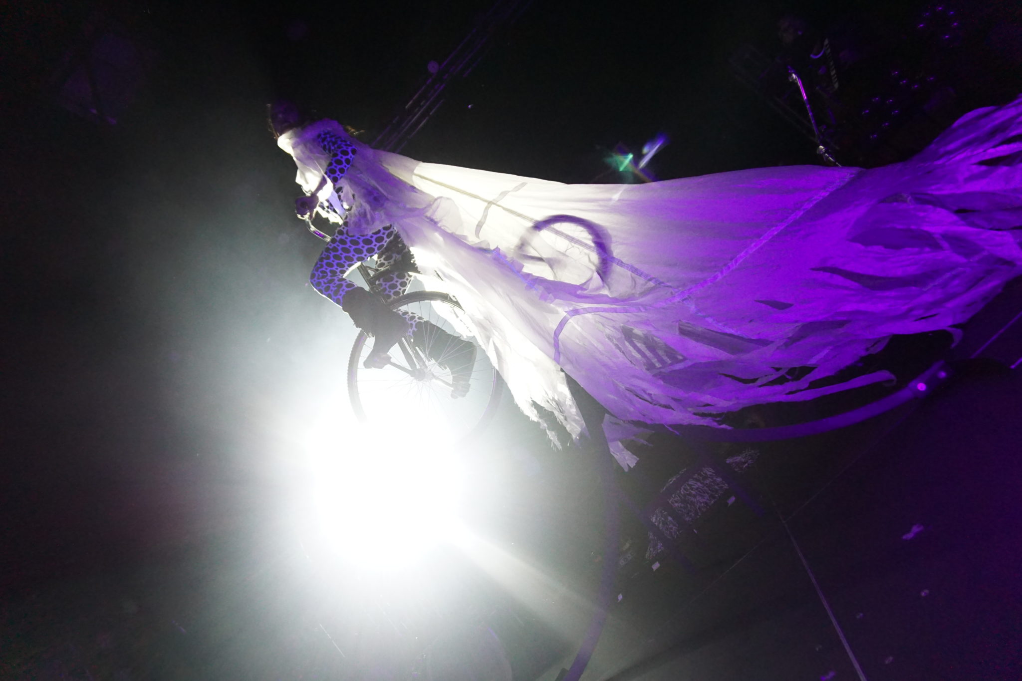 Suddenly a spotlight revealed the remarkable Zoe Jakes. Riding high atop a motionless bicycle, her cape billowed across the stage. From this point on, the night continued flowing through traditional Beats Antique jams and exciting new visual performances. A feathered goddess revealed her ancient moves whilst glowing creatures got funky in the low light.