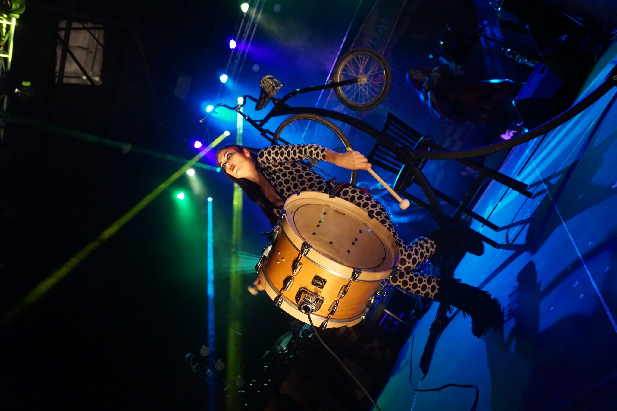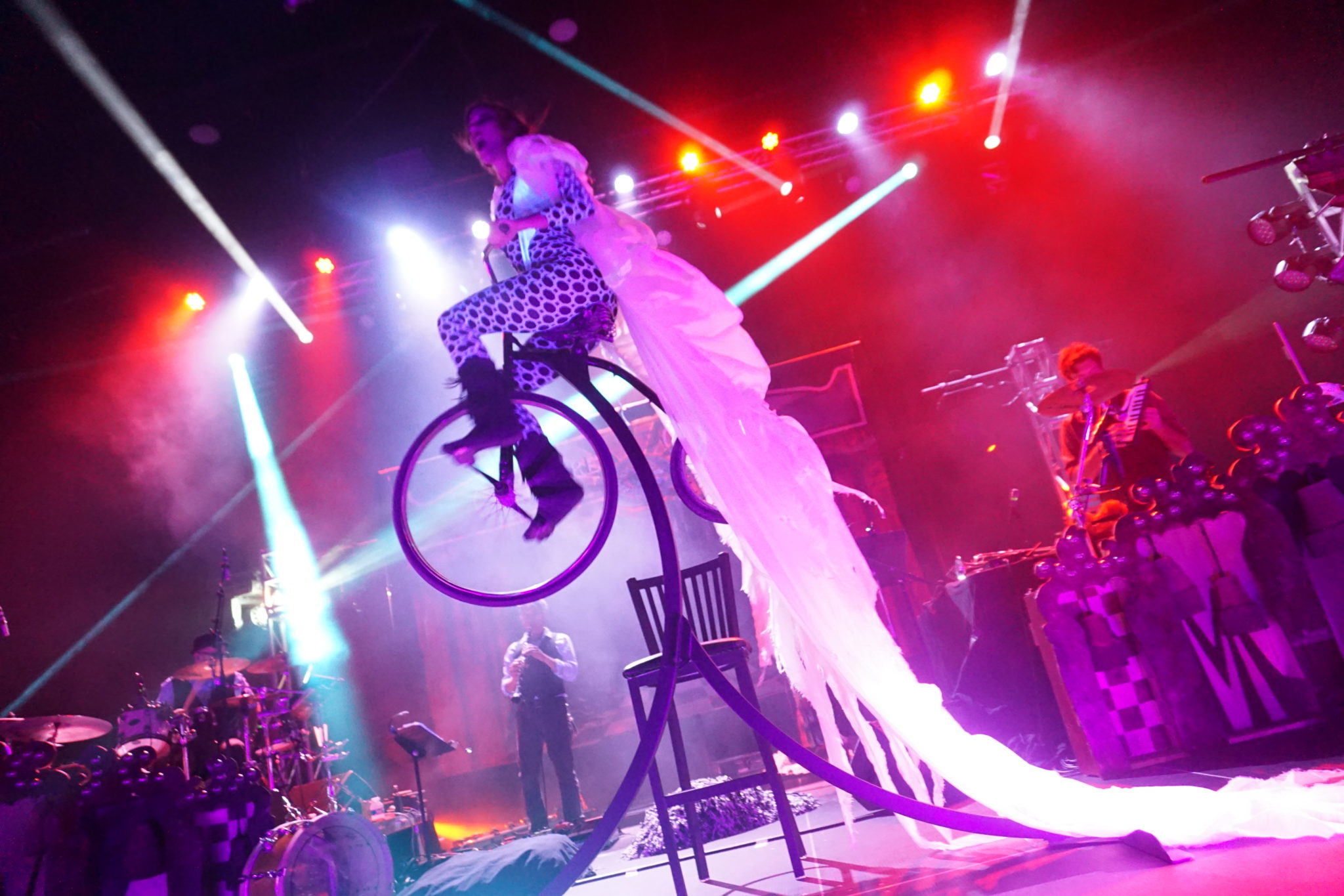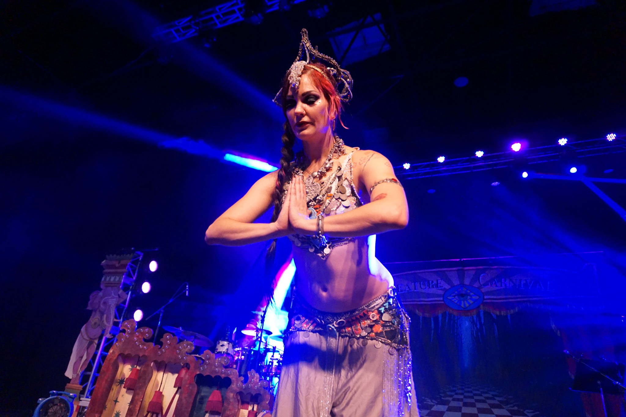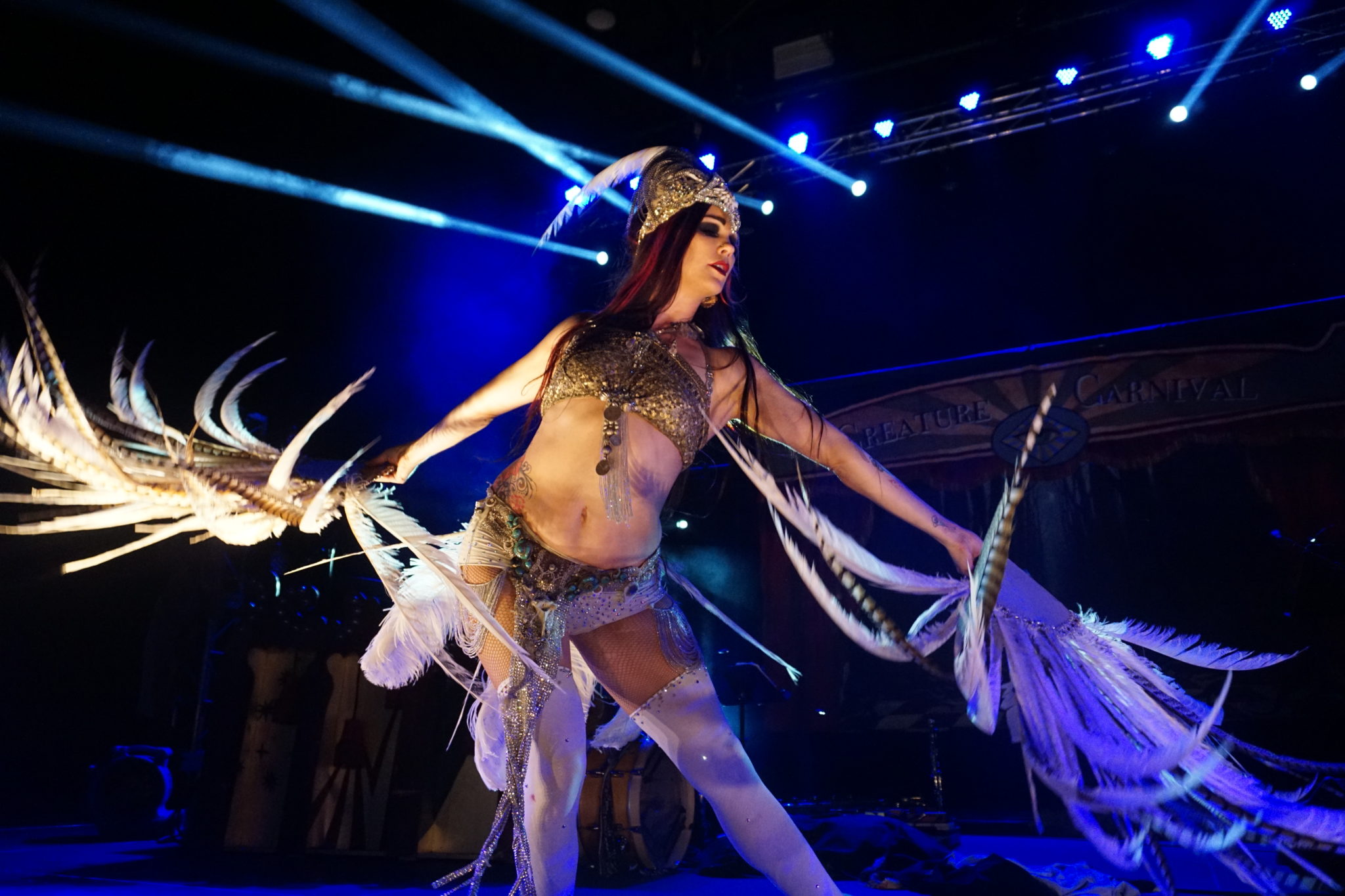 Suddenly a spotlight revealed the remarkable Zoe Jakes. Riding high atop a motionless bicycle, her cape billowed across the stage. From this point on, the night continued flowing through traditional Beats Antique jams and exciting new visual performances. A feathered goddess revealed her ancient moves whilst glowing creatures got funky in the low light.