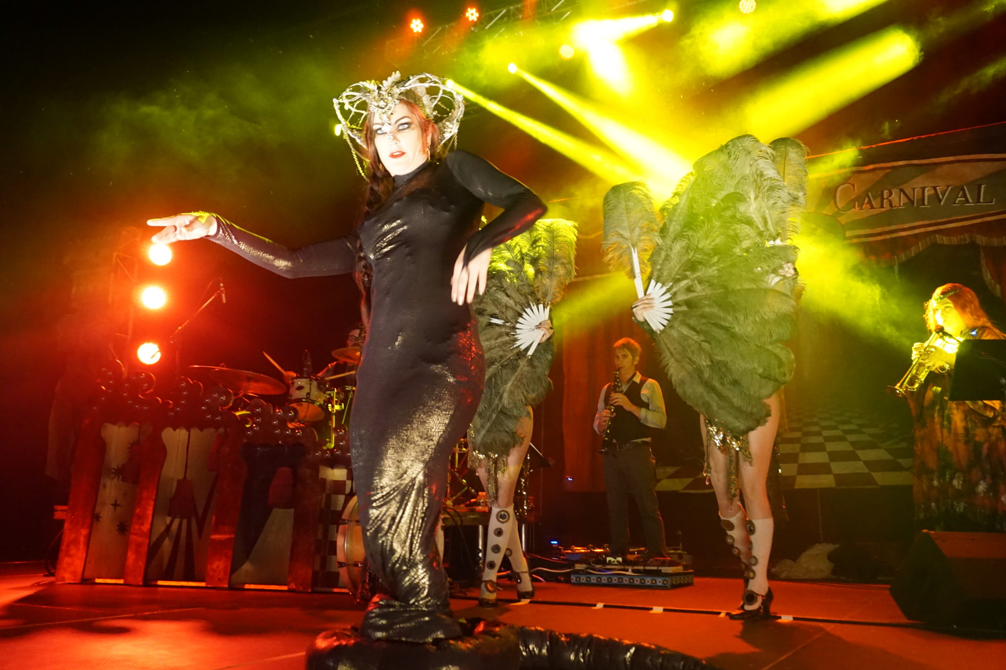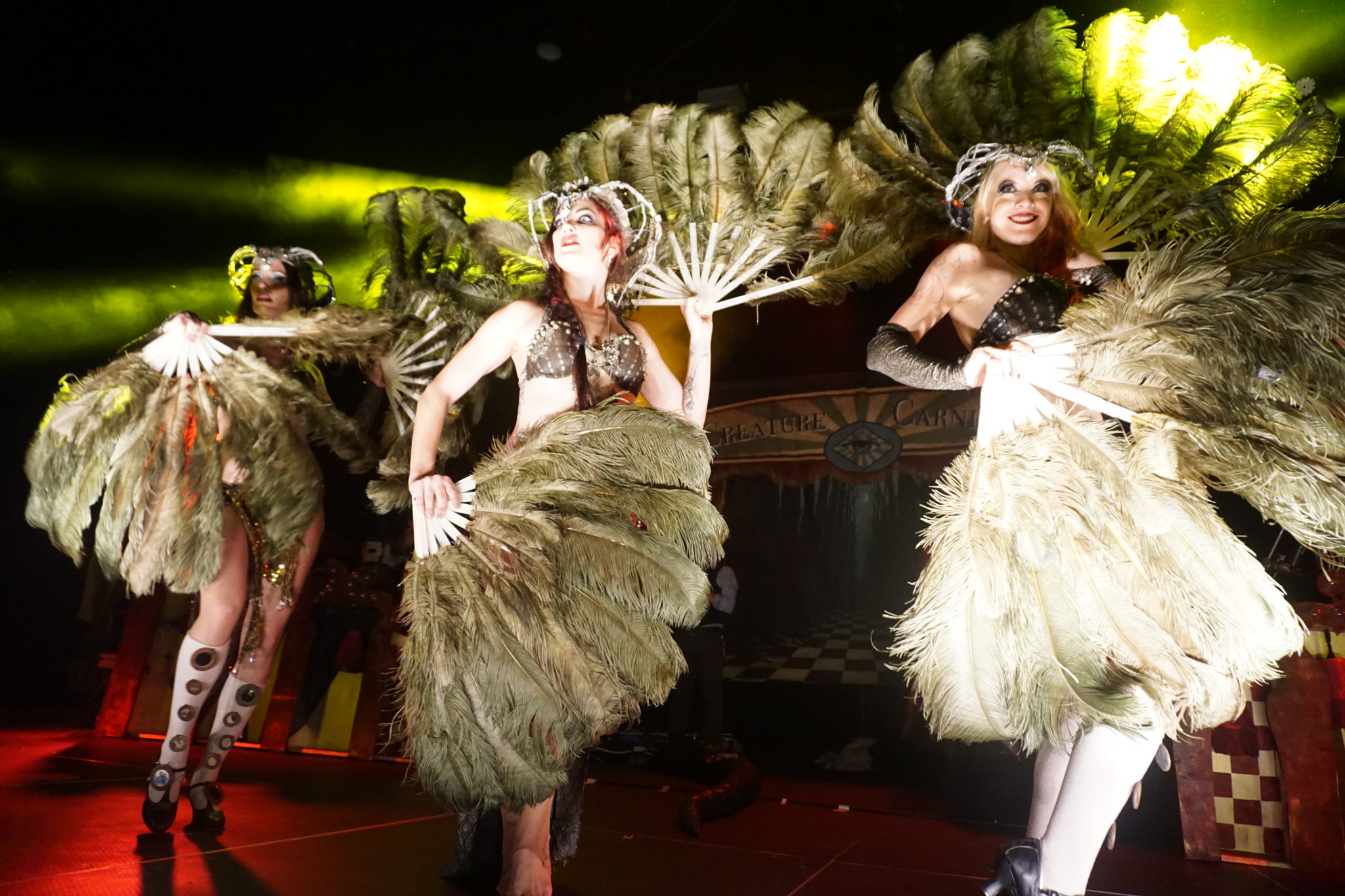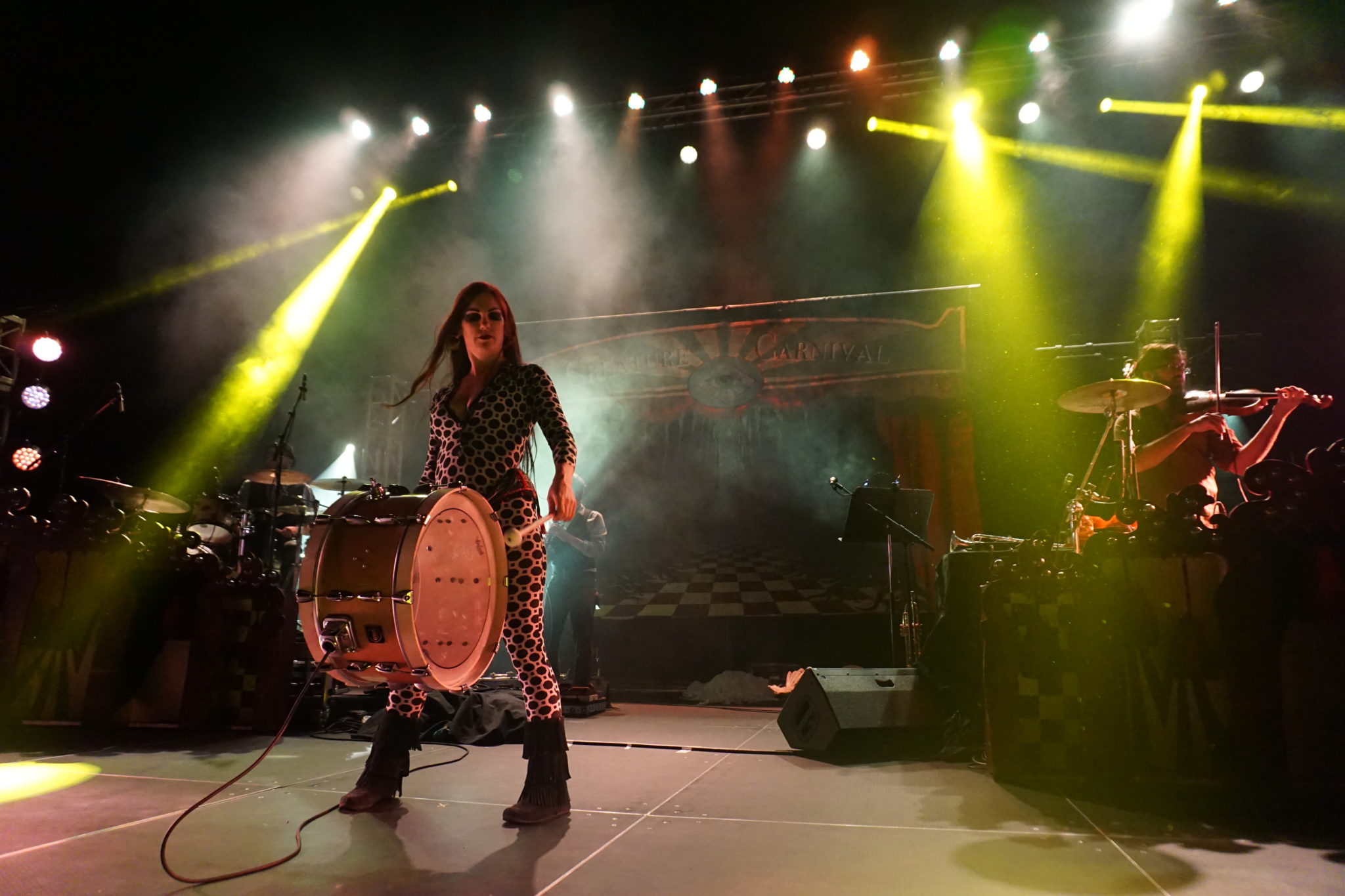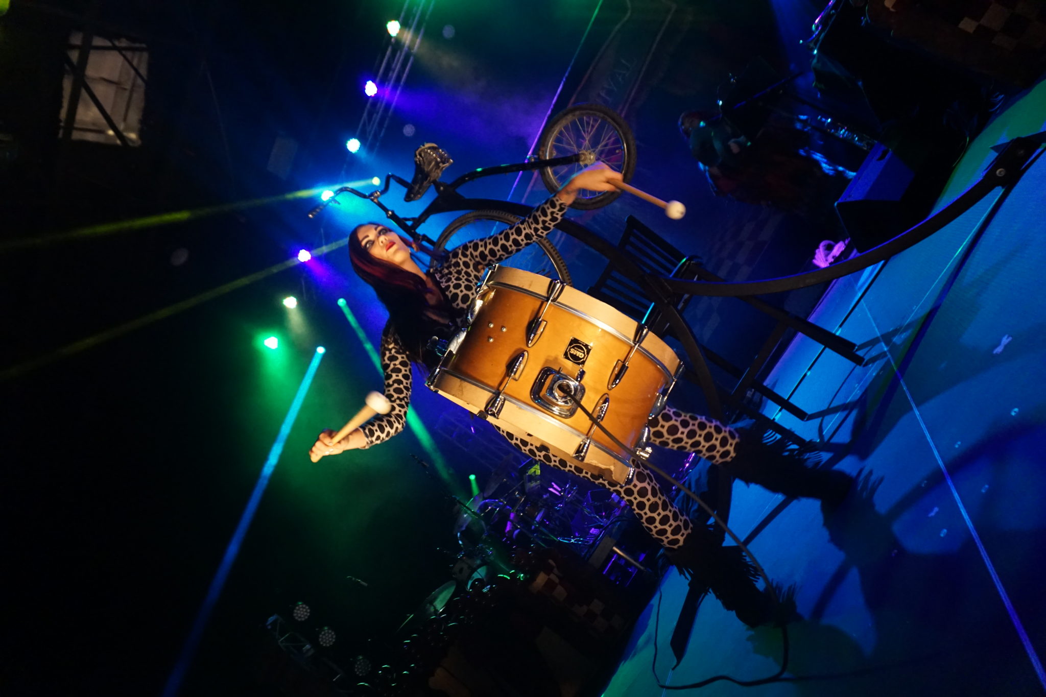 Suddenly a spotlight revealed the remarkable Zoe Jakes. Riding high atop a motionless bicycle, her cape billowed across the stage. From this point on, the night continued flowing through traditional Beats Antique jams and exciting new visual performances. A feathered goddess revealed her ancient moves whilst glowing creatures got funky in the low light.
