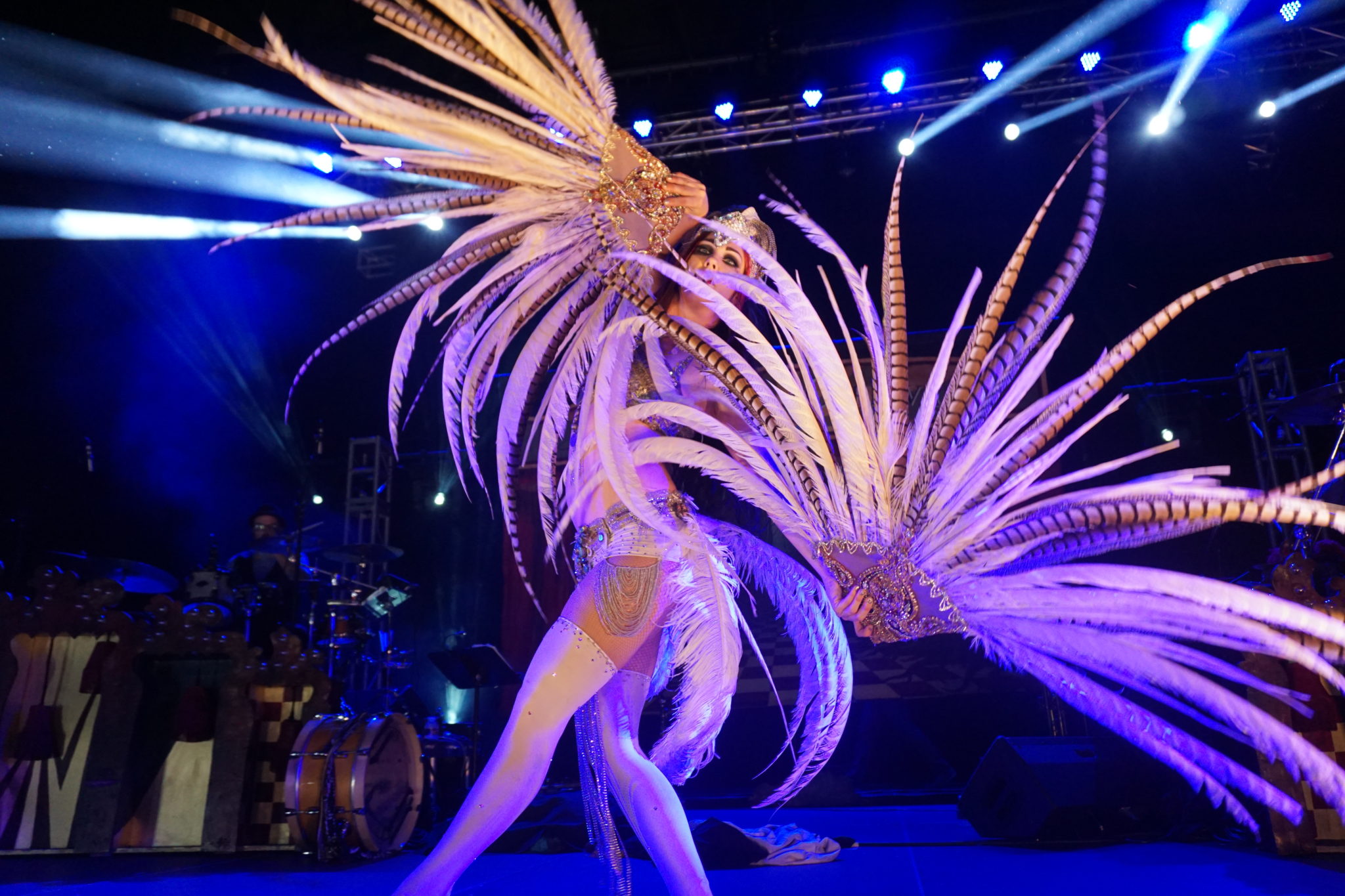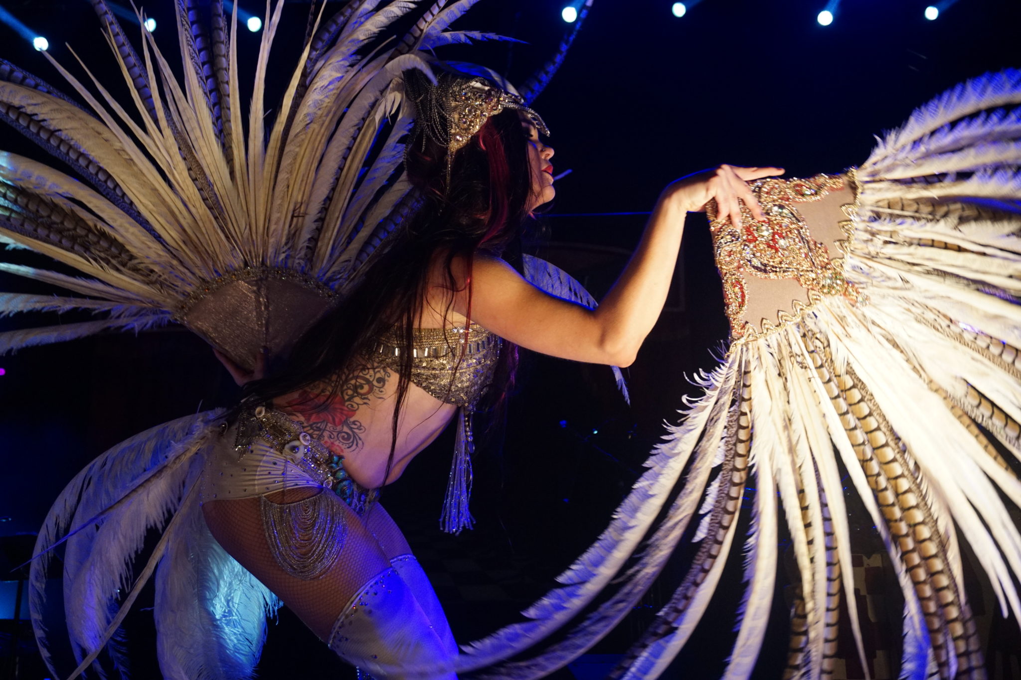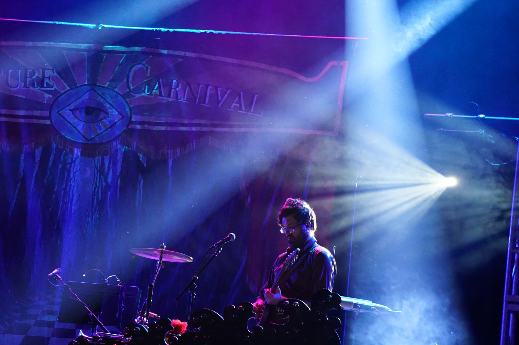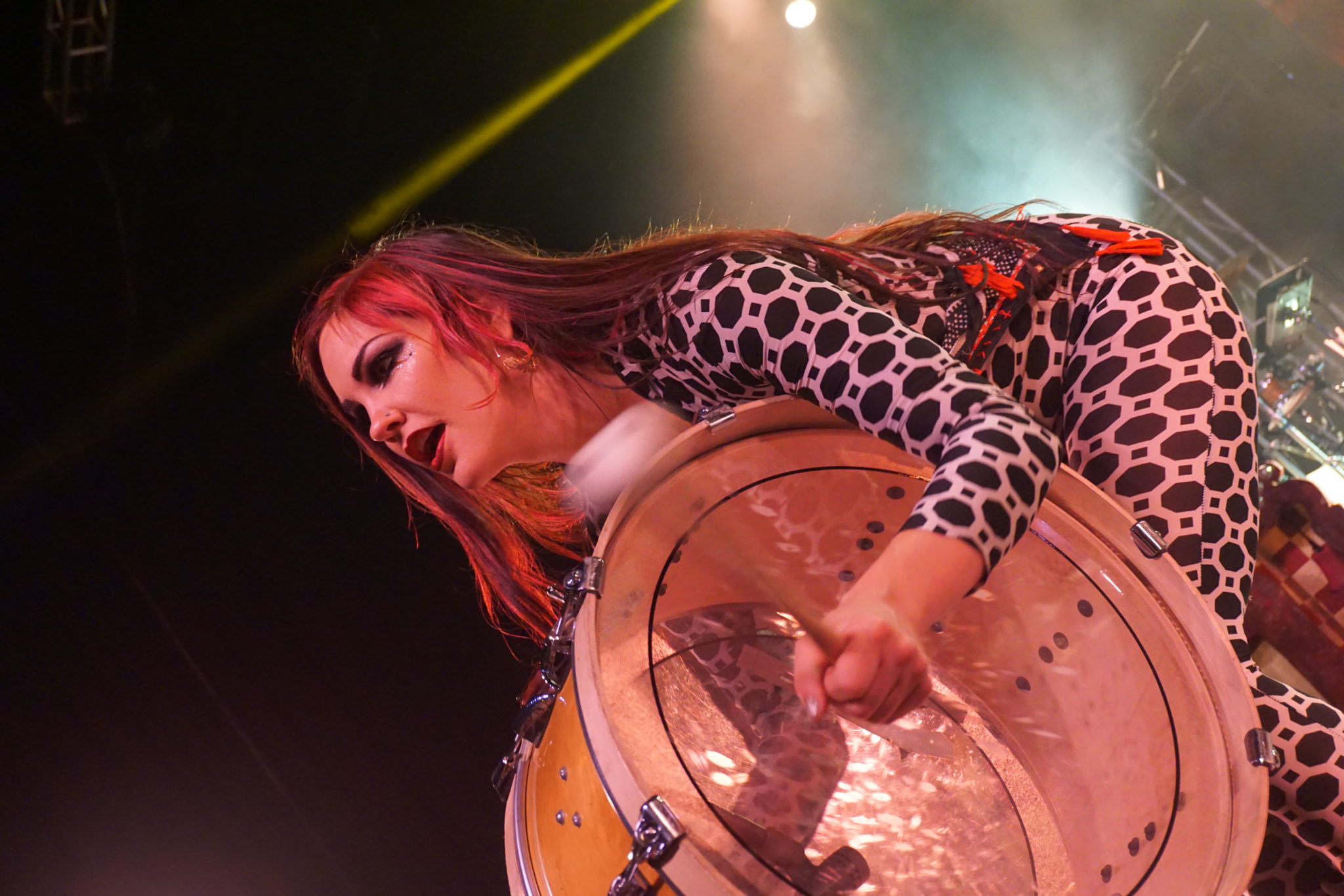 Suddenly a spotlight revealed the remarkable Zoe Jakes. Riding high atop a motionless bicycle, her cape billowed across the stage. From this point on, the night continued flowing through traditional Beats Antique jams and exciting new visual performances. A feathered goddess revealed her ancient moves whilst glowing creatures got funky in the low light.