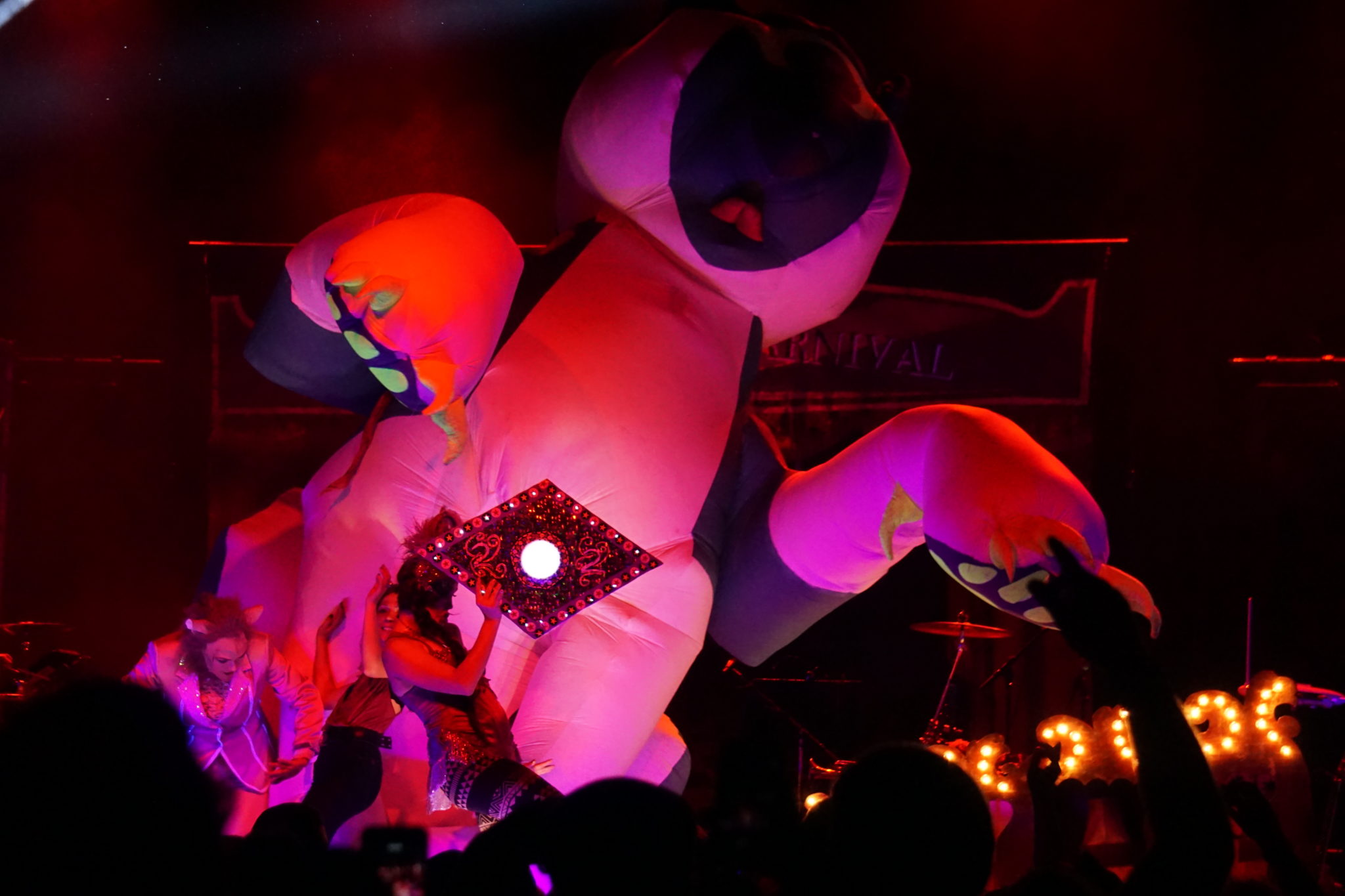 At one point, a lucky audience member was invited to join the carnival, only to have her presence summon the likes of a giant multi-armed cyclops kitty. All of these acts perfectly accompanied the horn-infused electro fusion dance music of Beats Antique. Band members David Satori and Sidecar Tommy Cappel did what they do best, and paved a path of good vibes and soul music.